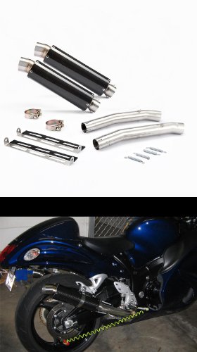 2007-2013 Suzuki GSX-R 1300 Hayabusa Carbon GP ExhaustDo you want to give your bike the sound and look of a real GP bike? Don't look any further! The Danmoto Carbon GP mufflers are race inspired exhausts, made with the same technique as the real MotoGP exhausts. They have a deep, throaty sound you will enjoy. Every exhaust is completely hand crafted by one of our skilled technicians. The sleeve is made from 12K carbon fiber with a high gloss finish.It's not a thin layer of Carbon look-a-like on a metal tube, like some other manufacturers use it. Mid pipe, end caps and inner construction of the exhaust is completely SS304 Stainless steel. All welds have been done by a TIG welding expert. This exhaust offers massive weight savings over the original exhaust. One muffler weighs less than 1kg; the whole setup including mid pipe and all mounting hardware weighs in total just about 4kg. The mufflers have 300mm sleeve lenght and 90mm OD. Every Danmoto Exhaust is developed specially for each bike. Installation of this exhaust requires no fuelling adjustments/tuning. It gives an instant power increase over stock of average 4%.With adjusted fuelling even more is possible. If you want to see/hear the exhaust on the bike, please visit YouTube and search for "Danmoto". Hundreds of happy customers uploaded videos of our exhausts on their bikes. The exhausts are sold as open "Race Version" without Baffle. This does not mean these are just empty pipes which sound like a tin can. Inside the exhaust is a bike specific core with a packing of long lasting fiber material, specially composed for this application. An additional baffle is available, which reduces the noise level but keeps the nice tone and rumble. Scope of delivery: 1 Set = 2 mufflers, 2 mid pipes, Mounting hardware Note:Our Danmoto Exhausts come without Bungs for O2 sensors.