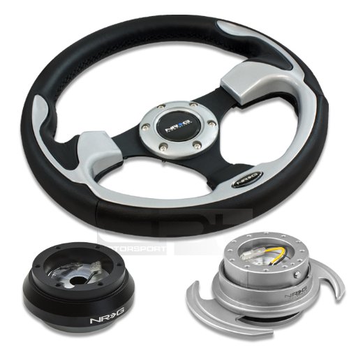 NRG-SRK-120H+001SL+650SL, NRG Innovations 12.5" 320mm Black Leather Silver Trim Racing Steering Wheel Combo with 6 Hole Short Hub Adapter with Gen 3.0 with Handle Silver Quick Release Kit SRK-120H